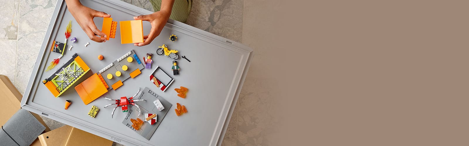 - La boîte contient tout le nécessaire pour créer une aire de cascades modulaire avec 2 rampes de lancement, des obstacles, des flammes, une cage aux araignées, une moto à rétrofriction, ainsi que la figurine de Tread Octane de la série LEGO® City.