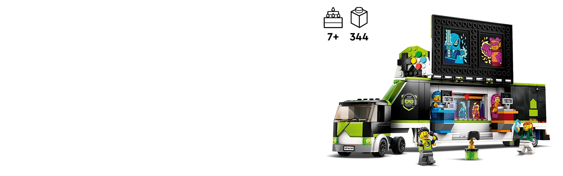- Que contient la boîte ? – Tout le nécessaire pour créer un camion de tournois de jeux vidéo avec une scène, 2 stations de jeu sur ordinateur et un écran de stade, ainsi qu’un trophée pour le vainqueur, des produits dérivés et 3 minifigurines