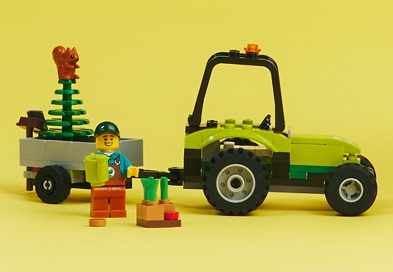 Les enfants partent en expédition pour planter des arbres avec Le tracteur forestier LEGO City (60390), qui inclut un tracteur avec une remorque, un arbre, de jeunes plants et des outils de jardinier, ainsi qu’une minifigurine de jardinier, une coccinelle et un écureuil.