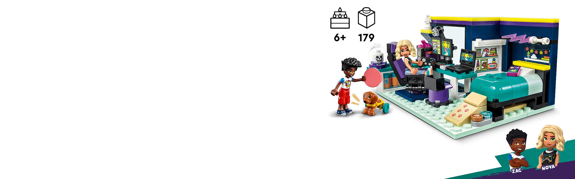Les enfants dès 6 ans découvrent La chambre de Nova LEGO Friends (41755). Zac avait peu de choses en commun avec Nova, jusqu’à ce qu’il découvre qu’elle adore les jeux vidéo, comme lui ! Les enfants vont aimer le PC avec le clavier et les néons, le fauteuil de gamer et le micro. Ils peuvent aider les personnages à prendre soin de Pickle, le chiot que Nova a pris sous son aile. Le set inclut un établi sur lequel Nova peut réparer le chariot à roulettes de Pickle et une rampe qui aide le chien à grimper au pied du lit. Les enfants vont adorer identifier tous les détails, comme le poster caché, qui révèlent les autres passions de Nova.