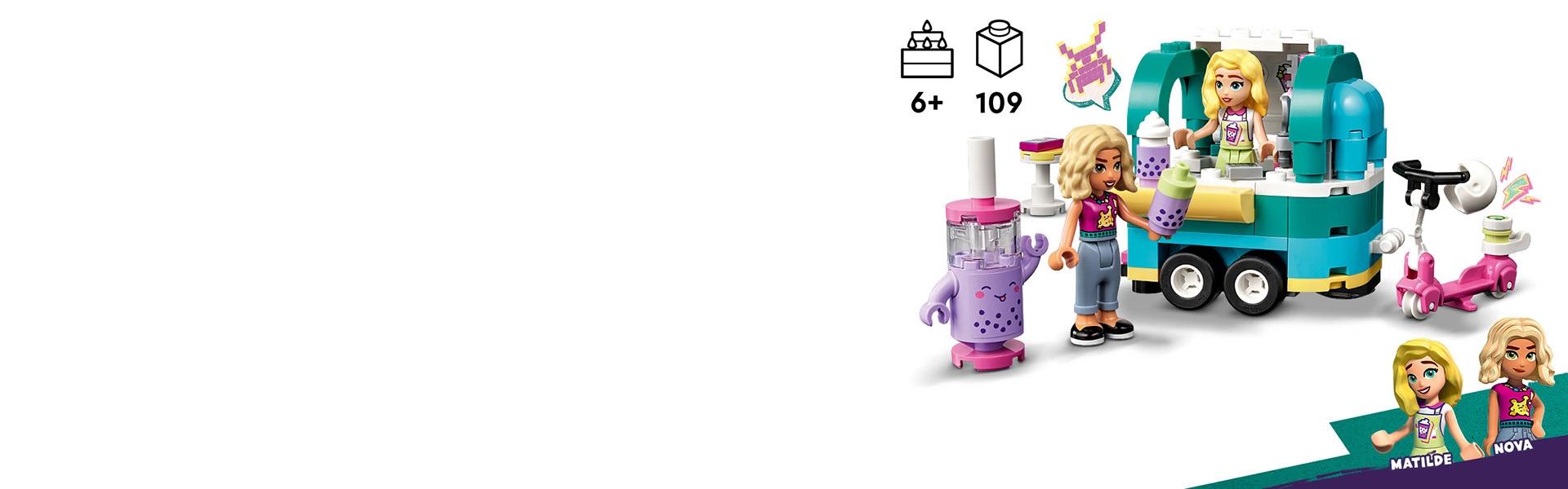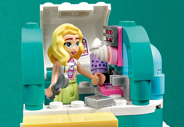 - 2 mini-poupées et des accessoires – Le set inclut les personnages LEGO Friends de Nova et Mathilde, de la crème fouettée, 2 bouteilles de bubble tea, une caisse enregistreuse, une table et une mascotte avec un menu