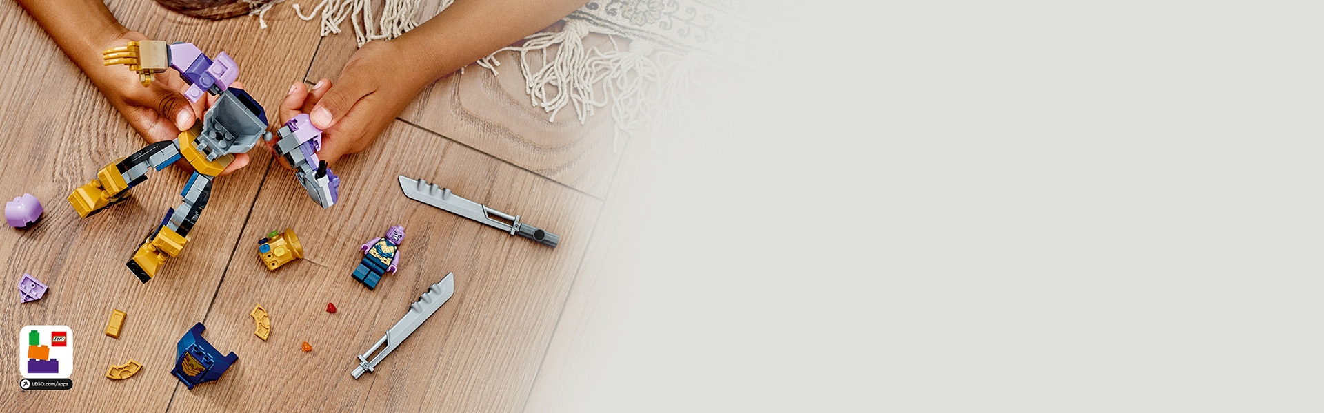 La minifigurine LEGO de Thanos peut être placée dans le cockpit ouvrant du robot. Grâce à ses bras, jambes et doigts entièrement articulés, elle peut prendre différentes poses, ce qui offre de multiplies options pour jouer ou créer une pièce à exposer. L’aventure ne s’arrête jamais avec l’épée à double tranchant, le Gant de l’infini et les Gemmes de l’infini. La construction est encore plus amusante avec l’appli LEGO Builder, qui inclut des outils de zoom et de rotation permettant aux enfants de visualiser leur modèle en construisant.